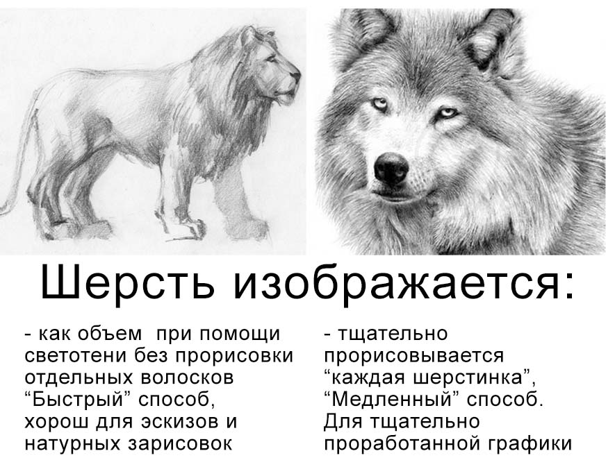 - На первой иллюстрации показаны два основных способа рисования животных. Я предлагаю способ, сочетающий быстроту первого и детальность проработки.